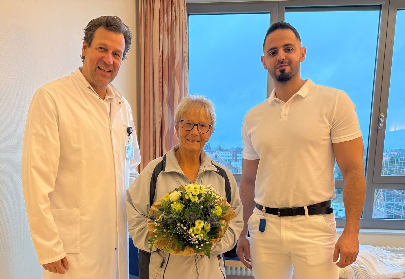 (v.l.n.r.) Dr. med. Philipp Werner (Chefarzt der Klinik für Orthopädie/Unfallchirurgie), Patientin Dore Büürma und Mohannad Alsulaiman (Oberarzt der Klinik für Orthopädie/Unfallchirurgie).