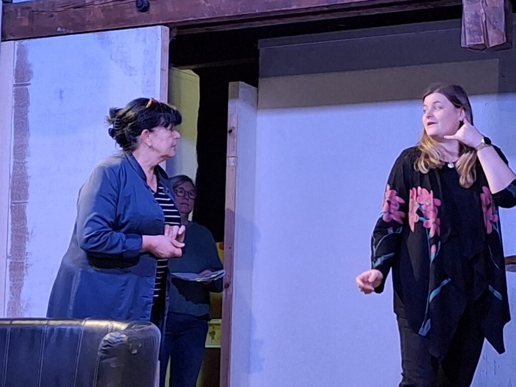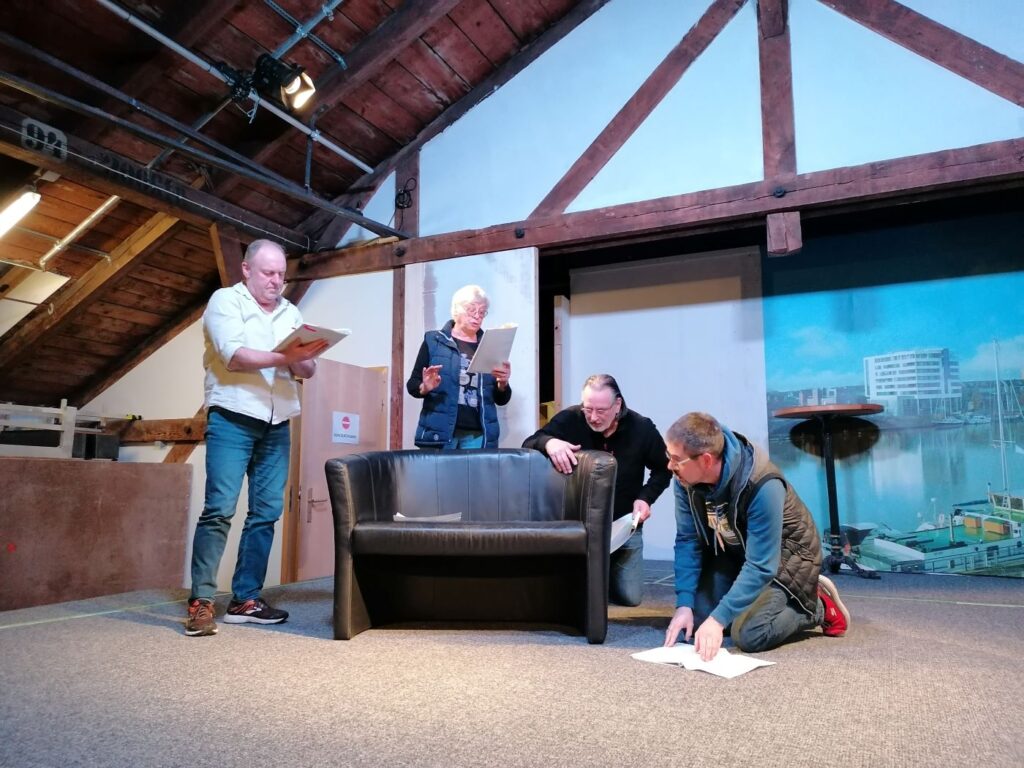 Das Ensem­ble bei der Erar­bei­tung ver­schie­de­ner Sze­nen aus „Twee unner een Deken“ im Zollhaus.