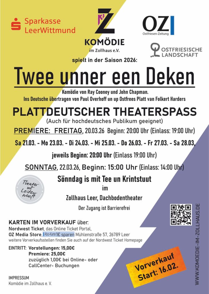 In der Spiel­zeit 2026 prä­sen­tiert der Thea­ter­ver­ein im his­to­ri­schen Zoll­haus eine tur­bu­len­te Ver­wechs­lungs­ko­mö­die in ost­frie­si­schem Platt. Mit dem Stück „Twee unner een Deken“ von Ray Coo­ney und John Chap­man steht ein Klas­si­ker des Bou­le­vard­thea­ters auf dem Pro­gramm, der durch sein rasan­tes Tem­po und poin­tier­te Dia­lo­ge besticht.