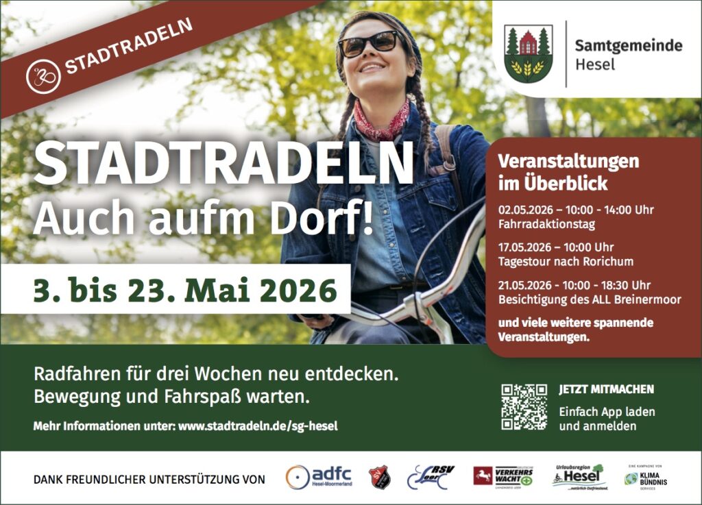 Im Mai wird die Samtgemeinde Hesel zur aktiven Fahrradregion. Vom 3. bis zum 23. Mai 2026 findet die bundesweite Aktion STADTRADELN statt, bei der es darum geht, möglichst viele Alltagswege klimafreundlich mit dem Rad zurückzulegen. Ein umfangreiches Rahmenprogramm aus Sport, Information und Gemeinschaft begleitet den Aktionszeitraum und bietet für alle Altersklassen passende Angebote.