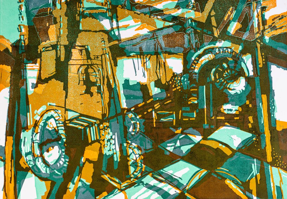 Der Druckgrafiker Uwe Schierholz (†) nähert sich dem Thema Ostfriesland auf abstrakte Weise. Seine Darstellungen von Industrieanlagen und Arbeitslandschaften werden in Farbflächen und Strukturen aufgelöst. Das Technische verliert hier seine Schwere und verwandelt sich in eine visuelle Poesie aus Form, Rhythmus und Kontrast.