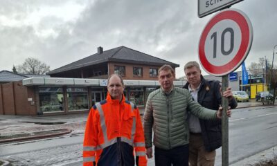 Aufgrund der extremen Straßenschäden wurde die Höchstgeschwindigkeit in Remels auf 10 km/h reduziert. (v.r.n.l.): Landtagsabgeordneter Ulf Thiele (CDU), Bürgermeister Heinz Trauernicht und Frank Buchholz (Landesamt für Straßenbau und Verkehr).