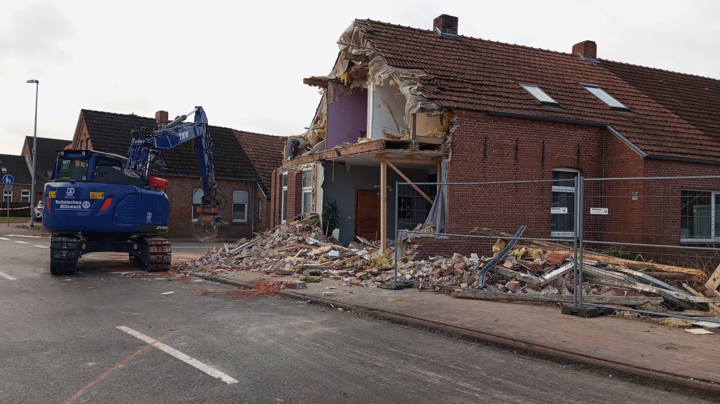 Im Rahmen der Begutachtung der Unfallstelle stellte sich heraus, dass die Statik des betroffenen Wohnhauses massiv beeinträchtigt war. Im Giebelbereich hatten sich bereits Mauerteile und Fenster gelöst. Um eine unkontrollierte Gefährdung von Passanten und Fahrzeugen auf der Kirchstraße zu verhindern, traf ein Fachberater des Technisches Hilfswerk (THW) Meppen eine weitreichende Entscheidung: Nach Rücksprache und Genehmigung durch das Kreisordnungsamt wurde der instabile Bereich des Mauerwerks kontrolliert mittels Bagger abgetragen.