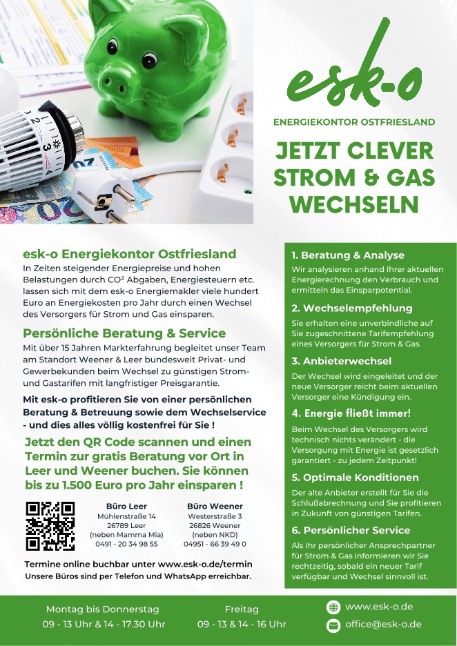 Das Büro in Weener als Anlaufstelle für Energiefragen: Das Team vom Energiesparkontor Ostfriesland (esk‑o) steht an den Standorten Weener und Leer für eine kostenlose und unverbindliche Beratung zur Verfügung. Gerade in wirtschaftlich herausfordernden Zeiten ist die Nachfrage nach Tarifoptimierungen hoch, weshalb eine frühzeitige Terminvereinbarung empfohlen wird, um individuelle Einsparpotenziale bei Strom und Gas voll auszuschöpfen.
