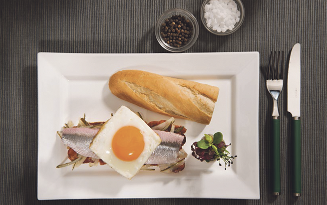 Mit krossem Bacon, Gold-Matjes und Spiegelei