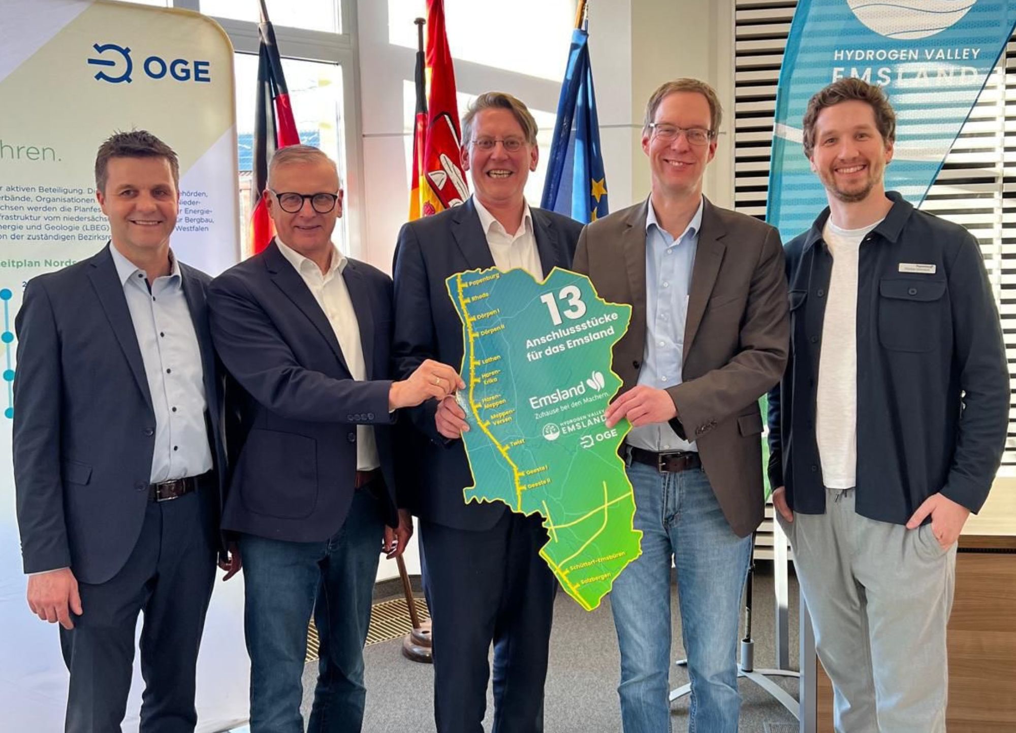 BU: V. l. n. r.: Hartmut Moorkamp (Landtagsabgeordneter), Helmut Wilkens (Bürgermeister der Samtgemeinde Lathen), Marc-André Burgdorf (Landrat des Landkreises Emsland), Hermann Wocken (Bürgermeister der Samtgemeinde Dörpen) und Christian Strentzsch (Leiter des Geschäftsbereiches Stadtentwicklung – Stadt Papenburg) freuen sich über die Anbindung des Landkreises an das Wasserstoff-Kernnetz. Bildquelle: Stadt Papenburg