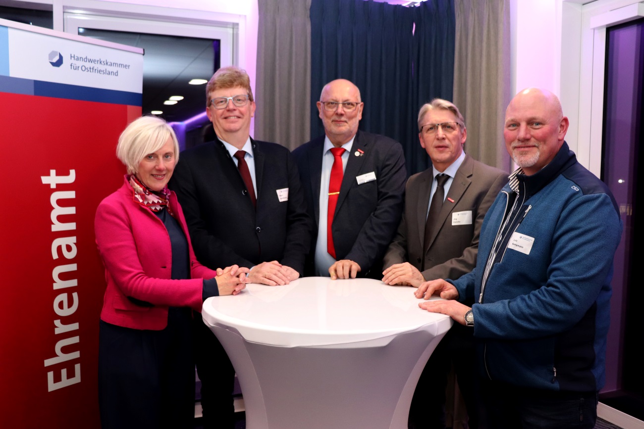 Das Ehrenamt im Gespräch (von rechts): Prüfer Lutz Kampmann(Simonswolde), Hauptgeschäftsführer Jörg Frerichs, Vizepräsident Jörg Klein,Präsident Albert Lienemann und Gisela Hillers, Leiterin des Meister- undFortbildungsprüfungswesens.