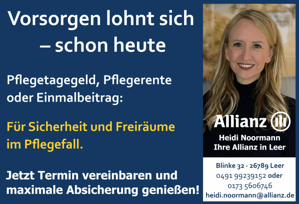 Pflege betrifft uns alle – früher oder später. Dass dieses Thema nicht nur ältere Menschen betrifft, macht Heidi Noormann, Fachfrau der Allianz-Versicherung in Leer, in einem persönlichen Gespräch deutlich.