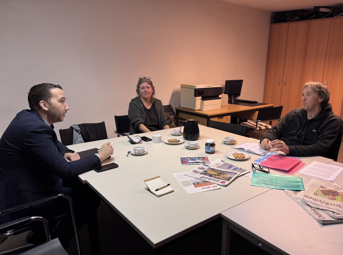 Nico Bloem (links) im Gespräch mit Gabi Schmidt-Leffers und Rikus Kolthoff von der Arbeitslosenselbsthilfe. Bild: privat