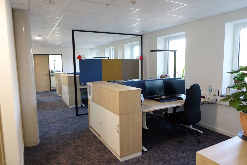 Hin­ter den öffent­li­chen Berei­chen arbei­ten die Ver­wal­tungs­teams in klar abge­grenz­ten Zonen. Dies gewähr­leis­tet nicht nur Daten­schutz, son­dern auch orga­ni­sa­to­ri­sche Sicher­heit. Voll­stän­dig digi­ta­li­sier­te Akten und Arbeits­pro­zes­se erlau­ben es, dass Auf­ga­ben jeder­zeit fle­xi­bel über­nom­men wer­den kön­nen – sei es bei Krank­heit oder Urlaub eines Mit­ar­bei­ters. Jeder Mit­ar­bei­ter ver­fügt über ein abschließ­ba­res Fach für per­sön­li­che Unter­la­gen, wäh­rend digi­ta­le Sys­te­me die Effi­zi­enz und Kon­ti­nui­tät der Arbeit sicher­stel­len. Dank der digi­ta­len Infra­struk­tur kön­nen die Mit­ar­bei­ten­den zudem fle­xi­bel arbei­ten, ob im Büro, im Home­of­fice oder an ande­ren Orten mit WLAN-Anschluss, was moder­ne Arbeits­mo­del­le wie Mobi­le Office oder Tele­ar­beit opti­mal unterstützt.