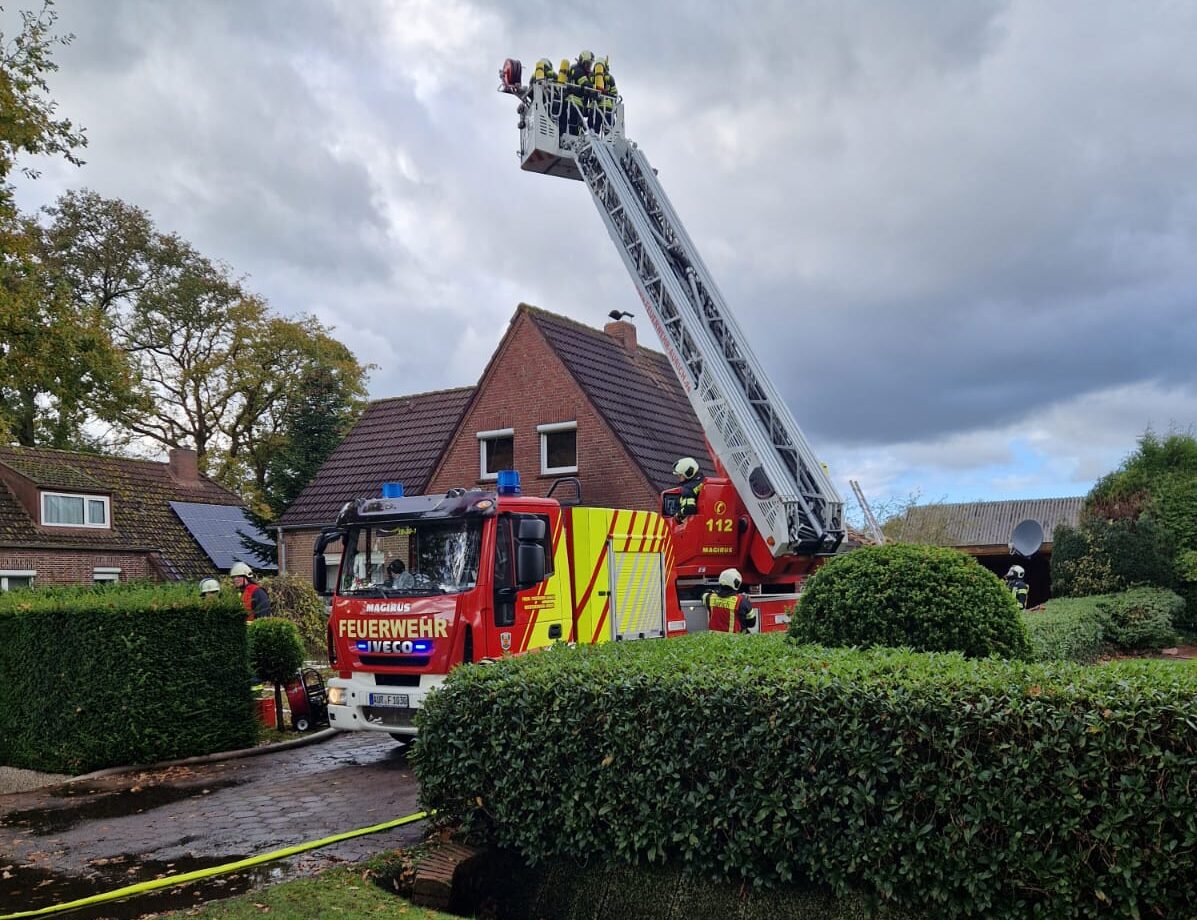 Akelsbarg. – Am Donnerstagmittag kam es in der Boßelstraße in Akelsbarg zu einem schweren Wohnhausbrand, bei dem zunächst unklar war, ob sich noch Personen im Gebäude befinden. Mehrere Feuerwehren aus der Gemeinde Großefehn, der Gemeinde Ihlow sowie der Stadt Aurich wurden daraufhin zu einem Einsatz mit dem Stichwort „Gebäudebrand mit Menschenleben in Gefahr“ alarmiert.