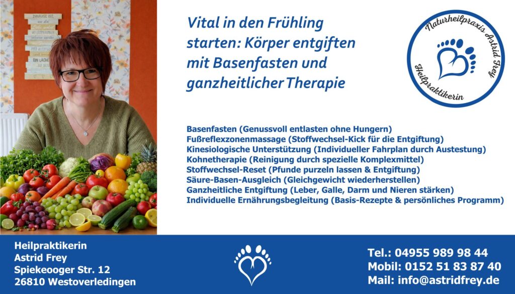 Kontakt für Informationen & Anmeldung: Naturheilpraxis Astrid Frey Spiekerooger Str. 12, 26810 Westoverledingen 📞 04955/9899844 oder 0152 5183 8740 📧 info@astridfrey.de