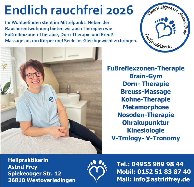 WESTOVERLEDINGEN – Der Jahresbeginn ist klassisch die Zeit der guten Vorsätze. Ganz oben auf der Liste vieler Menschen steht der Wunsch, endlich rauchfrei zu werden. Doch die Statistik zeigt: Ohne Unterstützung fallen viele nach nur wenigen Wochen in alte Muster zurück. Die Heilpraktikerin Astrid Frey aus Ihrhove setzt in ihrer Naturheilpraxis auf ganzheitliche Methoden, um den Ausstieg sanfter und erfolgreicher zu gestalten.