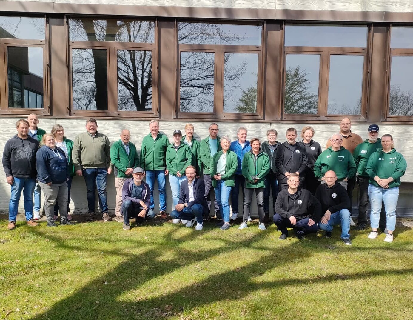 Gemeinsam stark für den Tierschutz: Das Gruppenfoto zeigt die Teilnehmer des 1. überregionalen Rehkitz- und Wildtierretter-Treffens vor der IGS Moormerland. Unter den Anwesenden begrüßte der erste Vorsitzende der Rehkitzrettung Moormerland e.V., Jens Krause (Mitte), auch den Schirmherrn und Bürgermeister Hendrik Schulz, die zusammen mit den vielen Ehrenamtlichen den Erfolg dieser Vernetzungsveranstaltung feierten.