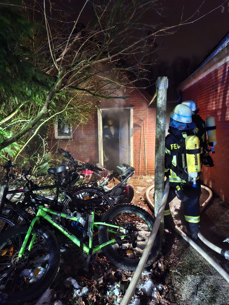 Aus bislang ungeklärter Ursache war in einem Schuppen, der unmittelbar an ein Wohnhaus angrenzt, ein Feuer ausgebrochen. Bei Ankunft der ersten Einsatzkräfte bestätigte sich die Lage. Um eine Ausbreitung des Brandes auf das angrenzende Wohngebäude zu verhindern, wurde umgehend ein Trupp unter Atemschutz zur direkten Brandbekämpfung eingesetzt.