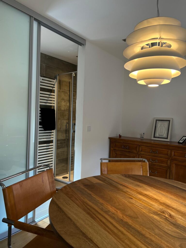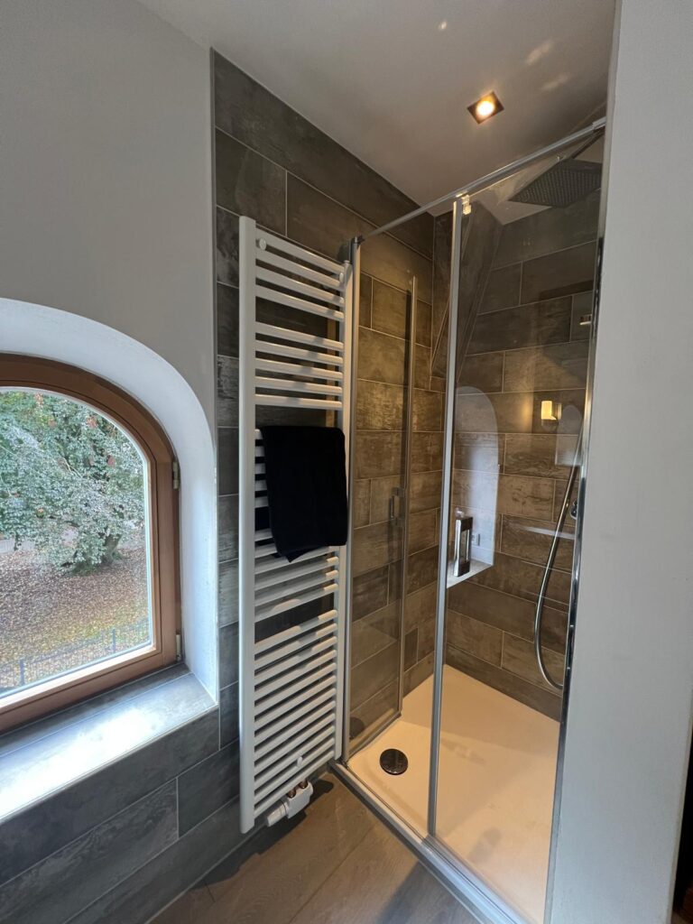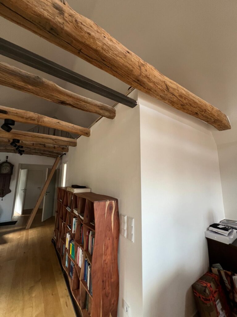 Auch im Dachgeschoss wurden alte Balken erhalten und ersetzt, während der Dachstuhl erneuert wurde. Dadurch bleibt der historische Charakter des Hauses spürbar, während moderne Wohnqualität und Technik integriert sind.