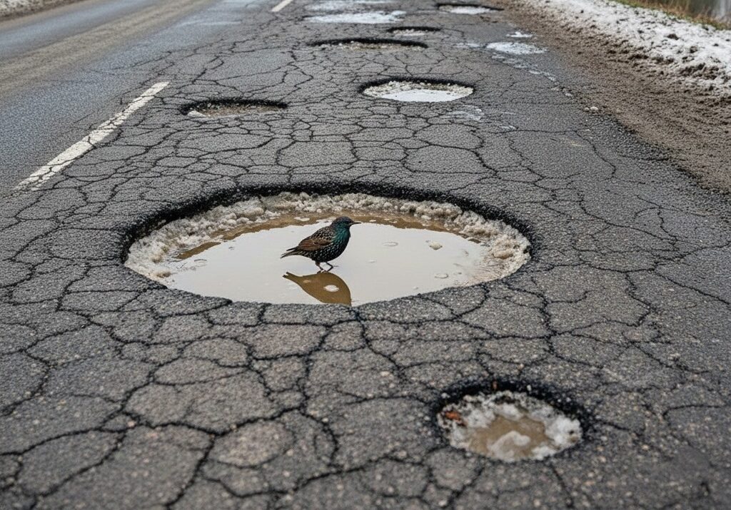 Frost und Tauwetter haben tiefe Spuren im Asphalt hinterlassen: Auf der L 24 in Remels ist ab sofort nur noch Schritttempo erlaubt. (Symbolfoto: KI-generiert)