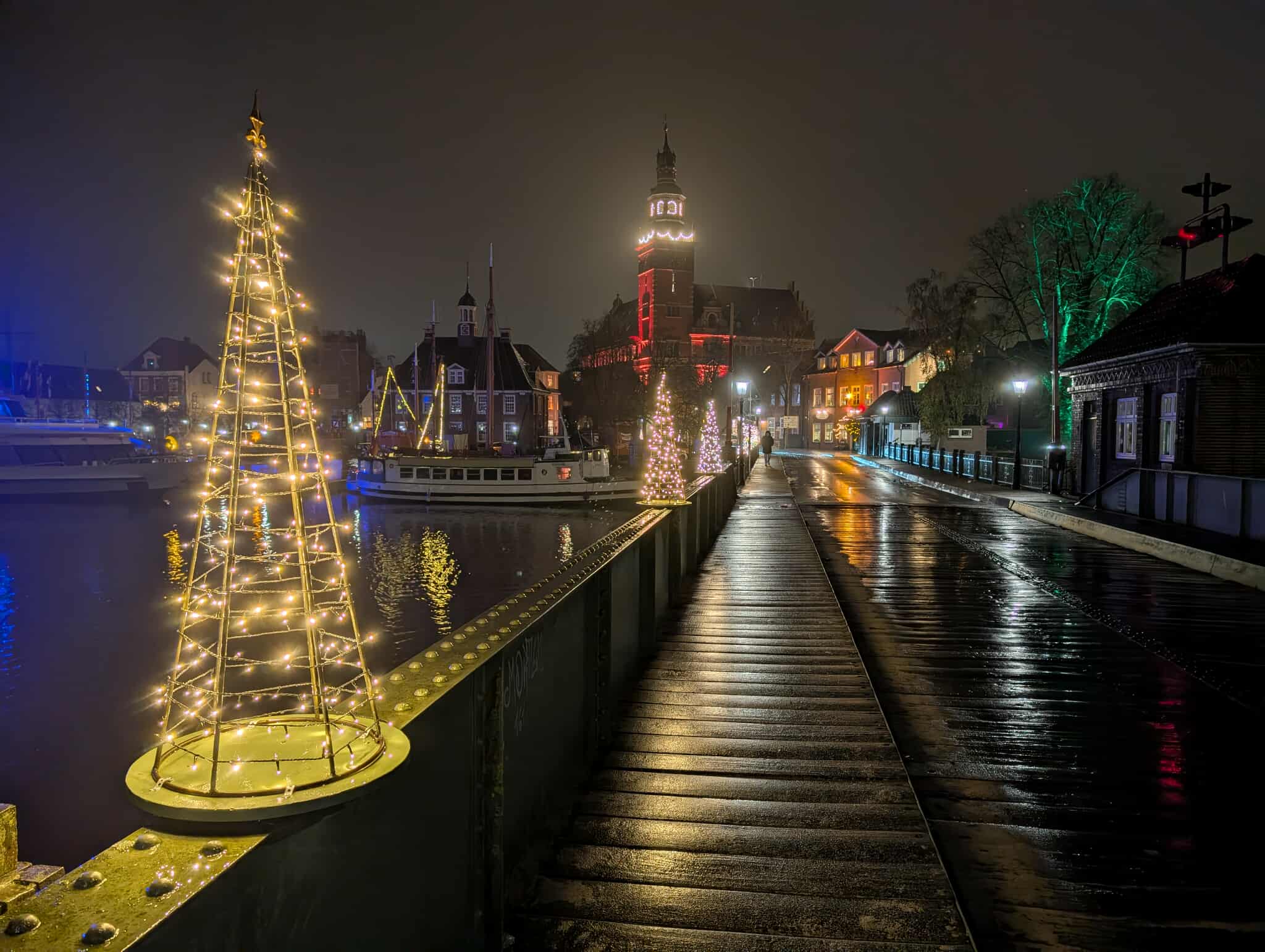 Insidertipp: Ein Abstecher in die Ostfriesische Teestube am Hafen rundet den Ausflug perfekt ab, mit Blick auf den Weihnachtsmarkt und die Rathausbrücke.