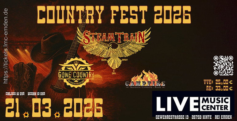 Am 21. März 2026 verwandelt sich das Live Music Center (LMC) in Hinte bei Emden in eine Hochburg für Country- und Western-Fans. Mit drei hochkarätigen Livebands, Line-Dance und echter Southern-Atmosphäre feiert das erste „Country Fest“ seine Premiere in Ostfriesland.