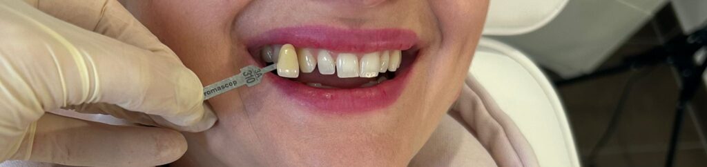 1. Farb­be­stim­mung: Zunächst wird die aktu­el­le Zahn­far­be exakt doku­men­tiert, um einen kla­ren Ver­gleich zum End­ergeb­nis zu ermöglichen.