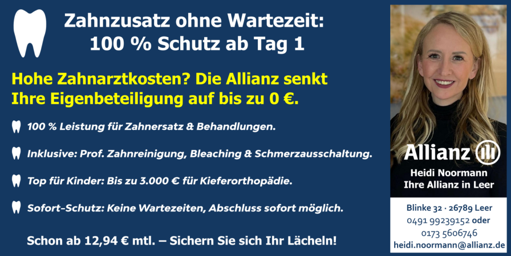 Ein strahlendes Lächeln ist das Ergebnis aus optimaler medizinischer Vorsorge und professioneller ästhetischer Pflege. In Leer bündeln Heidi Noormann (Allianz) und Thea Wittling (Weiss & Gesund Dentalkosmetik) ihre Kompetenzen, um dieses Ziel ganzheitlich zu erreichen. Während Heidi Noormann als erfahrene Allianz-Fachfrau dafür sorgt, dass erstklassige Behandlungen durch leistungsstarke Zahnzusatztarife zu 100 % abgesichert sind, sorgt Thea Wittling mit modernster Dentalkosmetik für die perfekte optische Vollendung. Gemeinsam bieten sie eine Rundum-Betreuung, bei der Gesundheit und Ästhetik Hand in Hand gehen.