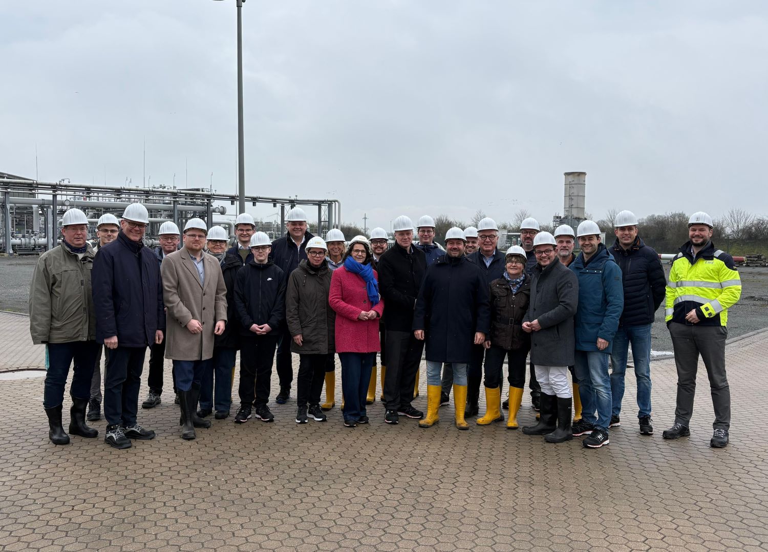 Gemeinsamer Vor-Ort-Termin in Jemgum: Die Vorstände der CDU Oldenburg und Ostfriesland besichtigten unter Leitung von Jochen Steinkamp (10. v. r.) und Ulf Thiele (12. v. r.) den EWE-Gasspeicher. Im anschließenden Austausch mit Justin Müller (Leiter Konzern Politische Angelegenheiten EWE AG, 5. v. r.) und Alexander Malchus (EWE Gasspeicher GmbH, ganz rechts) standen aktuelle Fragen der Energiepolitik im Fokus. Foto: CDU